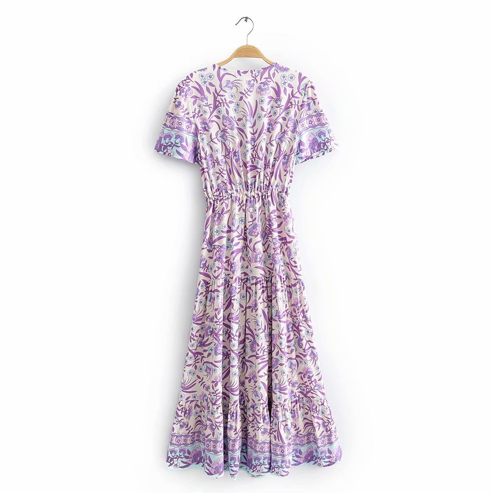 One is never over-dressed or under-dressed with the Boho Floral Print Short Sleeves Midi Dress. Features a beautiful feminine floral print , maxi flowy skirt and low V-neckline cutting, that make a perfect shape to your a feminine silhouette. Top up this lovely dress with your favorite open ankle-heels for a bohemian chic look.